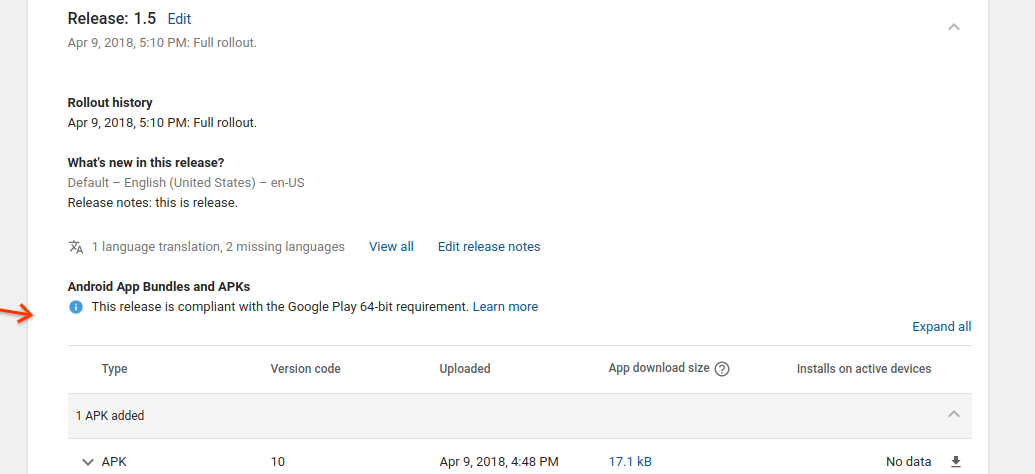 اگر از پشتیبانی چند-APK گوگل پلی برای انتشار برنامه خود استفاده میکنید، توجه داشته باشید که رعایت الزامات ۶۴ بیتی در سطح انتشار ارزیابی میشود. با این حال، الزامات ۶۴ بیتی برای APKها یا بستههای برنامهای که برای دستگاههای دارای اندروید ۹ پای یا بالاتر توزیع نشدهاند، اعمال نمیشود.