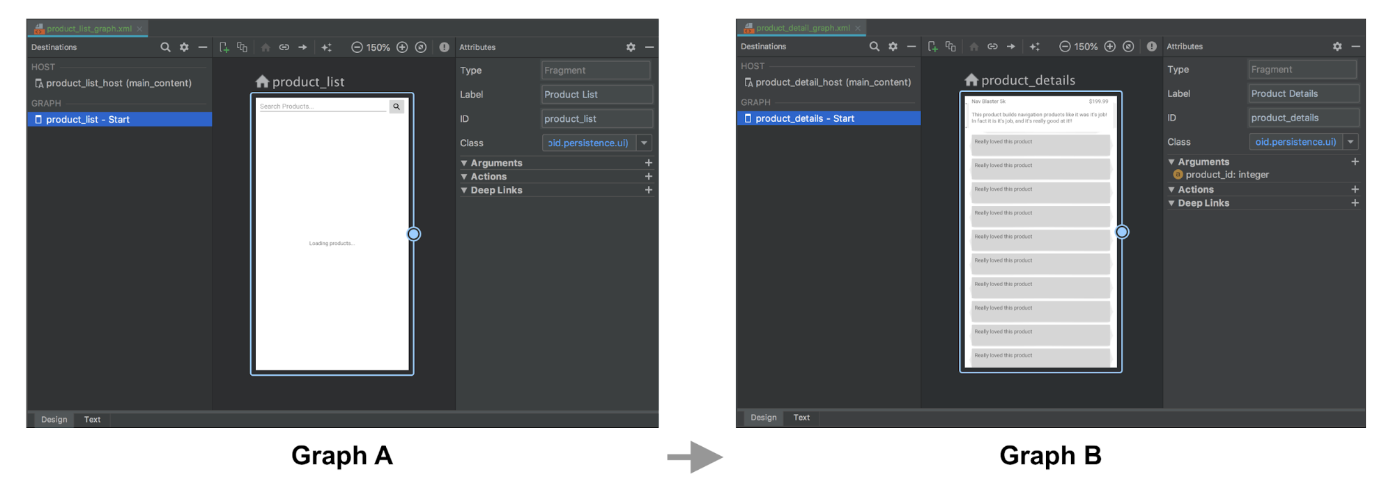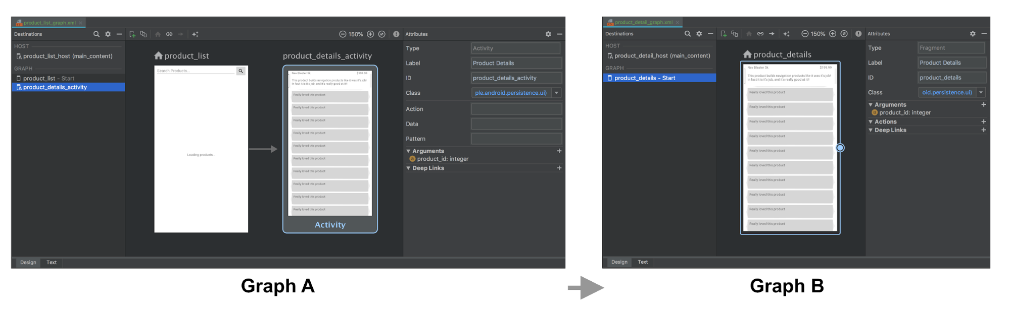 在以下示例中,图 A 定义 Activity 目的地,而后者具有 product_id 参数和操作。图 B 不包含任何更改。