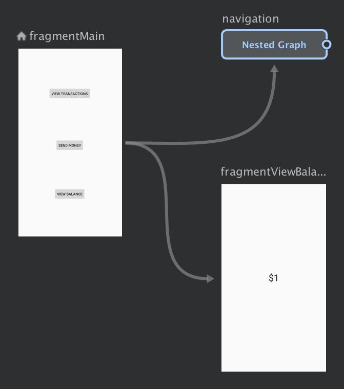 navigation요소와 자체 ID 및 중첩 그래프의 첫 번째 대상을 가리키는startDestination속성이 있습니다.<?xml version="1.0" encoding="utf-8"?> <navigation xmlns:app="http://schemas.android.com/apk/res-auto" xmlns:tools="http://schemas.android.com/tools" xmlns:android="http://schemas.android.com/apk/res/android" app:startDestination="@id/mainFragment"> <fragment android:id="@+id/mainFragment" android:name="com.example.cashdog.cashdog.MainFragment" android:label="fragment_main" tools:layout="@layout/fragment_main" > <action android:id="@+id/action_mainFragment_to_sendMoneyGraph" app:destination="@id/sendMoneyGraph" /> <action android:id="@+id/action_mainFragment_to_viewBalanceFragment" app:destination="@id/viewBalanceFragment" /> </fragment> <fragment android:id="@+id/viewBalanceFragment" android:name="com.example.cashdog.cashdog.ViewBalanceFragment" android:label="fragment_view_balance" tools:layout="@layout/fragment_view_balance" /> <navigation android:id="@+id/sendMoneyGraph" app:startDestination="@id/chooseRecipient"> <fragment android:id="@+id/chooseRecipient" android:name="com.example.cashdog.cashdog.ChooseRecipient" android:label="fragment_choose_recipient" tools:layout="@layout/fragment_choose_recipient"> <action android:id="@+id/action_chooseRecipient_to_chooseAmountFragment" app:destination="@id/chooseAmountFragment" /> </fragment> <fragment android:id="@+id/chooseAmountFragment" android:name="com.example.cashdog.cashdog.ChooseAmountFragment" android:label="fragment_choose_amount" tools:layout="@layout/fragment_choose_amount" /> </navigation> </navigation>코드에서 루트 그래프를 중첩 그래프에 연결하는 작업의 리소스 ID를 전달합니다.