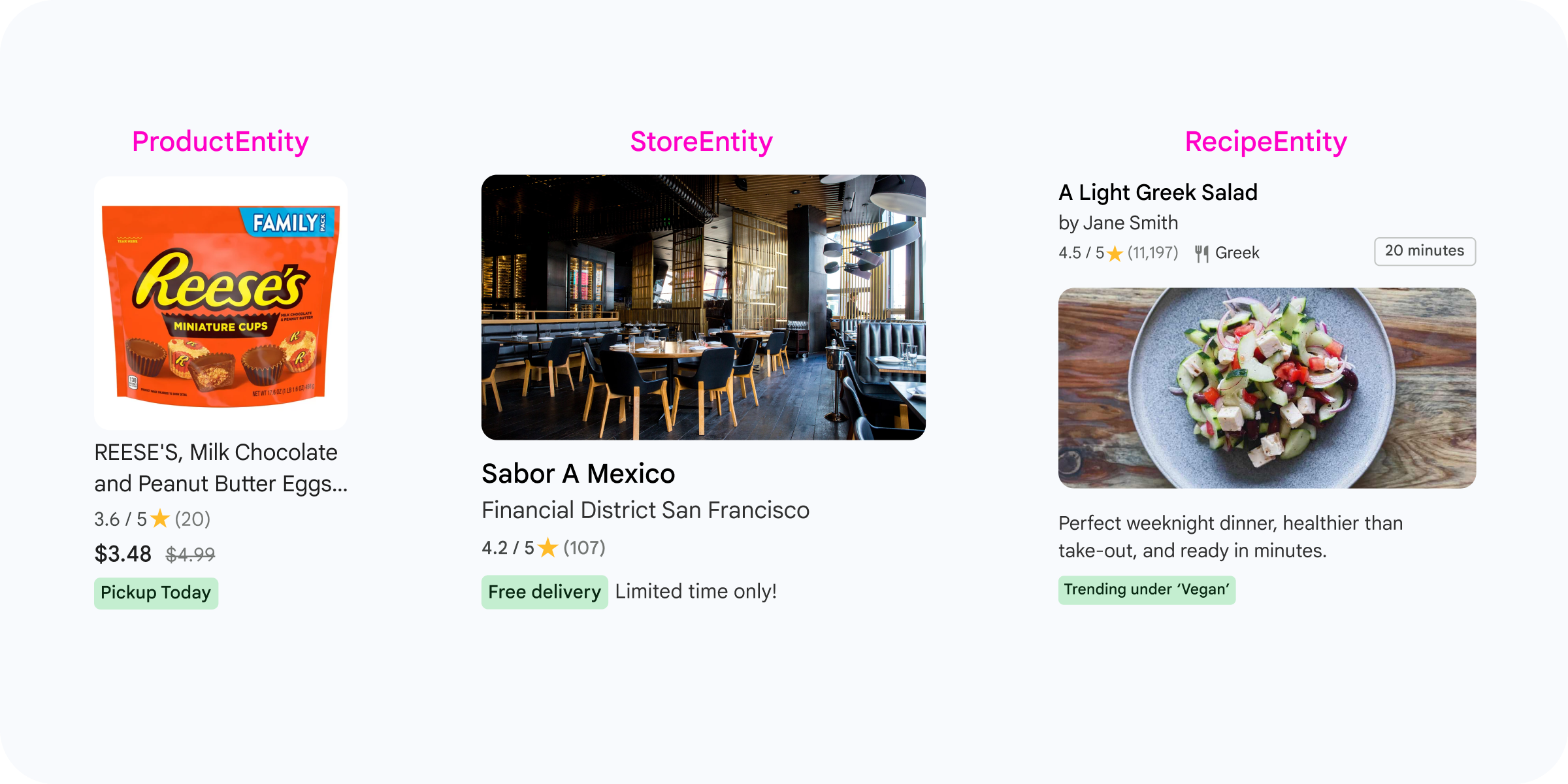 SDK telah menentukan entity yang berbeda untuk mewakili setiap jenis item. Kami mendukung entity berikut untuk kategori Makanan: