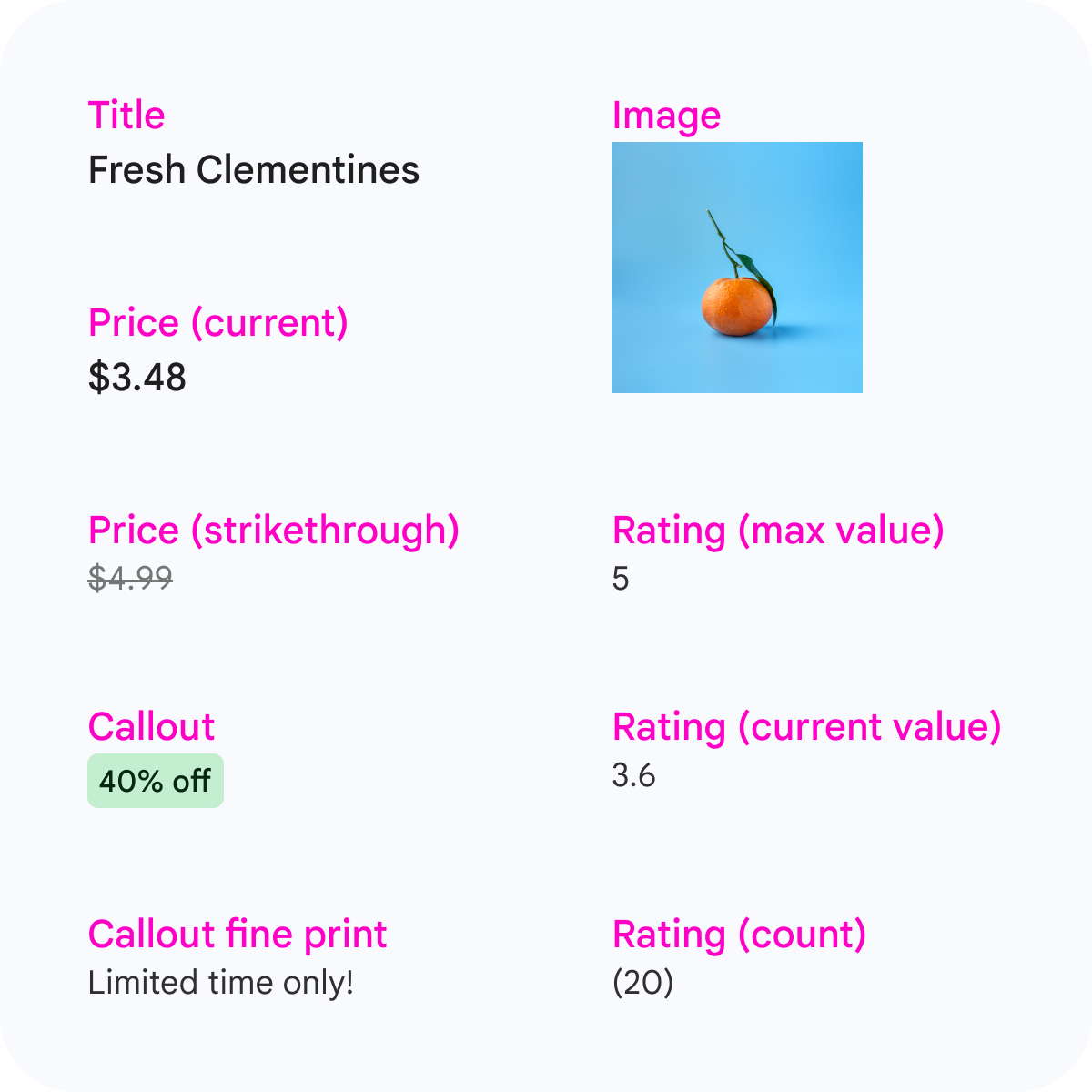 | Harga - coret | Opsional | Harga asli entity, yang dicoret di UI. | Teks bebas |