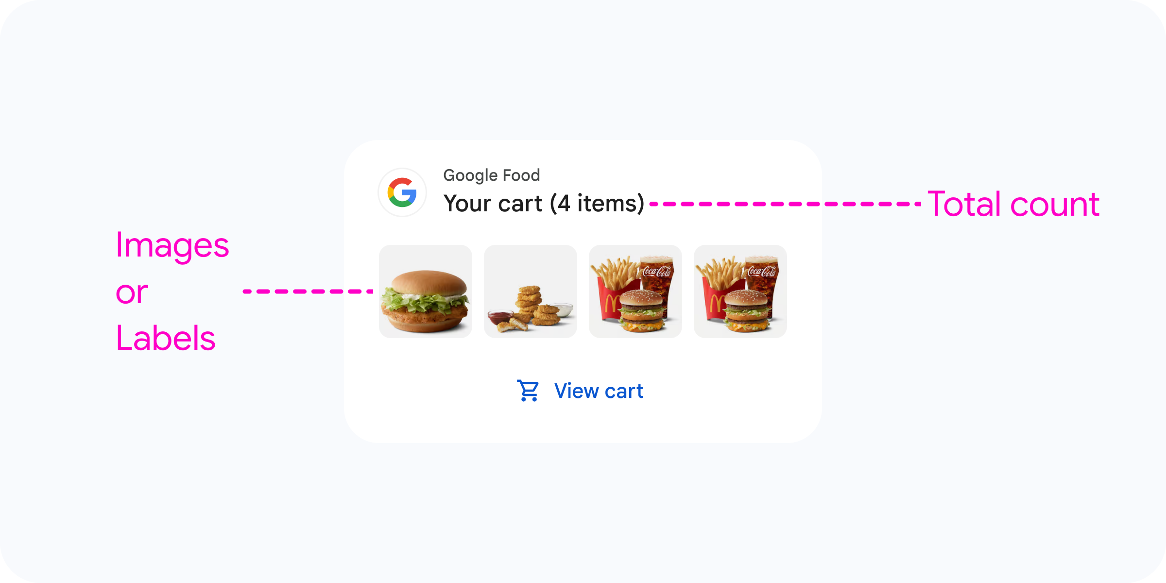 Cluster Keranjang Belanja Makanan harus menampilkan jumlah total item dalam keranjang dan juga dapat menyertakan gambar untuk item X dalam keranjang pengguna.