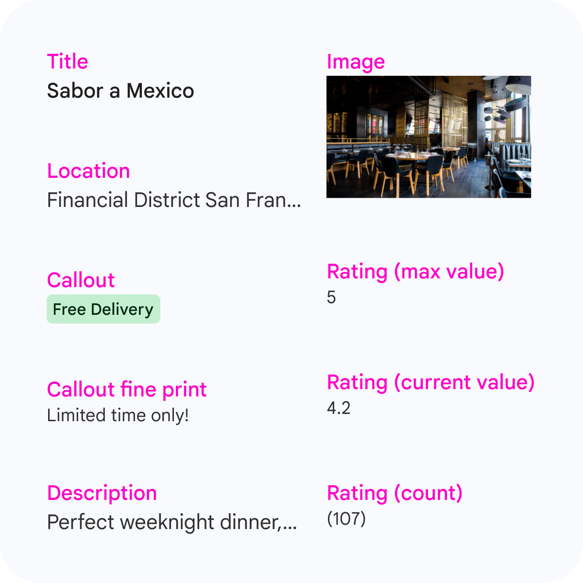 | Keterangan | Opsional | Keterangan yang menampilkan promo, acara, atau info terbaru terkait resep, jika tersedia. | Teks bebas Ukuran teks yang direkomendasikan: di bawah 45 karakter (Teks yang terlalu panjang dapat menampilkan elipsis) |