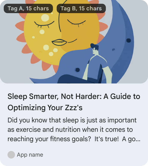 ArticleEntity: ArticleEntity מייצג המלצה לתוכן מבוסס-טקסט שקשור לבריאות ולכושר. הישות הזו יכולה לייצג כתבות חדשותיות לא גמורות או תוכן אחר שהמשתמש רוצה להמשיך לצרוך מהמקום שבו הוא הפסיק. לדוגמה: תקציר חדשות, תקציר של פוסט בבלוג בנושאים שקשורים לבריאות או לכושר.