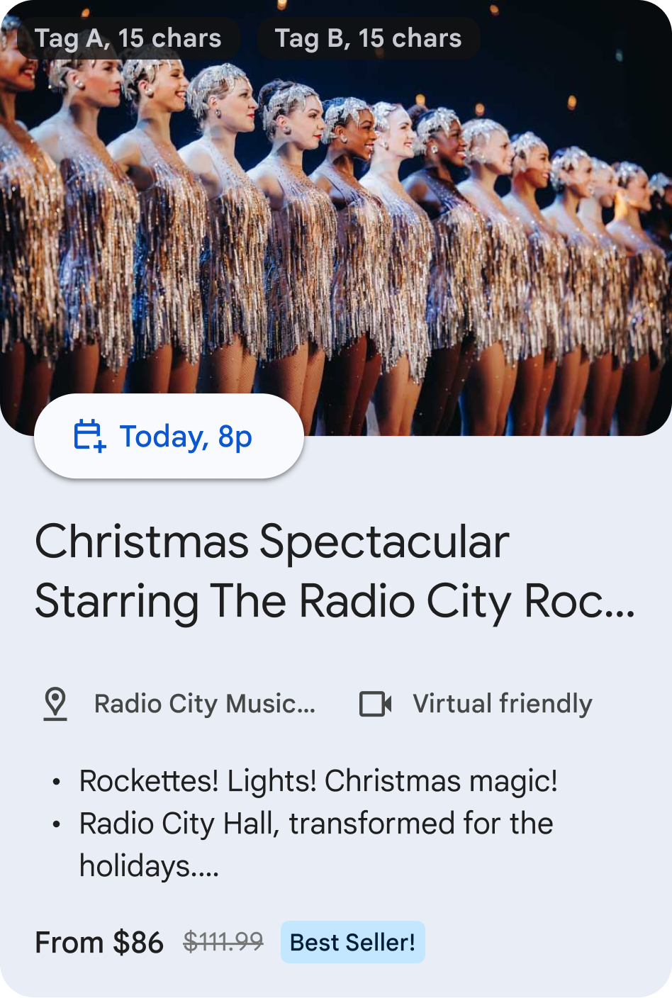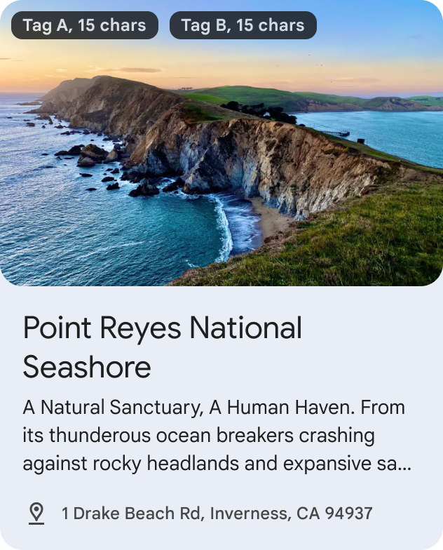 Les clusters Recommendation affichent des suggestions de voyages et d'événements personnalisées d'un développeur partenaire individuel. Ces recommandations peuvent être personnalisées en fonction de l'utilisateur ou généralisées (par exemple, les articles tendance). Utilisez-les pour afficher des recommandations d'articles, d'événements, d'hébergements ou de lieux d'intérêt.