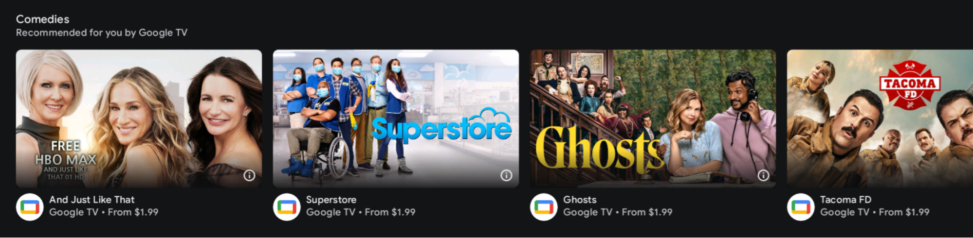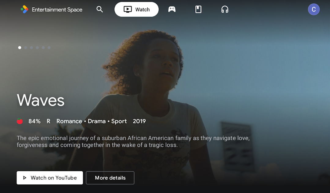 Rysunek 1. Interfejs Entertainment Space z grupą rekomendacji od jednego partnera. Jednostka: obiekt reprezentujący pojedynczy element w klastrze. Elementem może być film, program telewizyjny, serial, wideo na żywo i inne treści. Listę obsługiwanych typów elementów znajdziesz w sekcji Podaj dane o elementach.