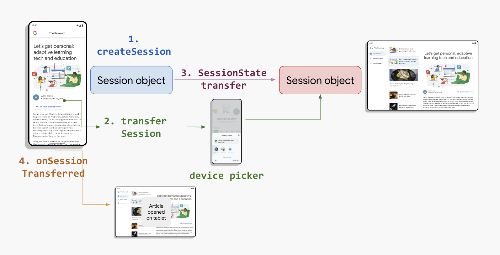 Sessions API, kaynak cihaz ile alıcı cihazı birbirinden ayırt eder. Kaynak cihaz, oturumu oluşturur ve kabul etmenizi sağlar. Kaynak cihazın kullanıcısı Kullanıcı, sistem iletişim kutusu tarafından sağlanan listeden bir cihaz seçer. Kullanıcı Alıcı cihazı seçtiğinde kaynak oturum aktarılır ve kaldırılır kaldırmamız gerekir.