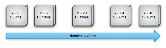 horizontally by 10 pixels. At the end of 40ms, the animation stops, and the object ends at