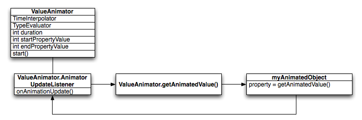 Let's take a detailed look at how the important components of the property animation system would calculate animations like the ones illustrated above. Figure 3 depicts how the main classes work with one another.