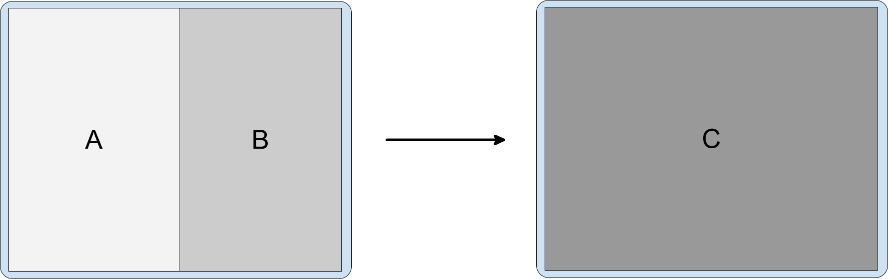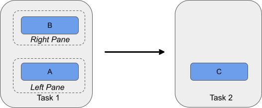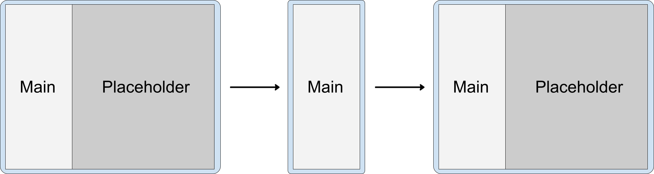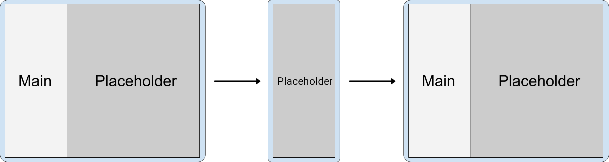Quando le modifiche alla configurazione del dispositivo riducono la larghezza della finestra dell'attività in modo che non sia abbastanza grande per un layout a più riquadri (ad esempio, quando un dispositivo pieghevole con schermo grande si piega dalle dimensioni di un tablet a quelle di uno smartphone o quando la finestra dell'app viene ridimensionata in modalità multi-finestra), le attività non segnaposto nel riquadro secondario della finestra dell'attività vengono impilate sopra le attività nel riquadro principale.