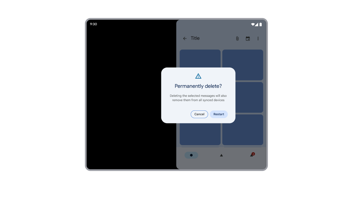 Режим совместимости размеров — это режим «почтового ящика», сохраняющий соотношение сторон приложения и включающий элемент управления перезапуском. Этот элемент управления позволяет пользователям перезапускать приложение и перерисовывать экран. Android использует режим совместимости размеров для приложений, размер которых не может быть изменён. Когда действие перемещается в контейнер отображения, несовместимый с размерами действия, система может изменить масштаб приложения, чтобы заполнить экран устройства как минимум в одном измерении.