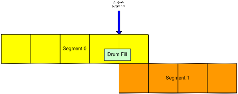 Die Markierung für das Ende des Segments kann um die Fertigstellung einer musikalischen Figur über das Ende des Stückes hinaus zu ermöglichen, markiert den Beginn des nächsten Segments. Zum Beispiel könnte der Autor des Inhalts erstelle ein Segment mit 4 Takten und einer Trommelfüllung, die mit Takt 1 von 5 endet. Balken, ein Balken jenseits des natürlichen Endes des Segments. Indem Sie ein Ende eines Segments Markierung am Ende des 4. Balkens setzen, wird das nächste Segment ausgelöst, aber die Trommelfüllung wird parallel zum nächsten Segment fortgesetzt. für musikalische Kontinuität.