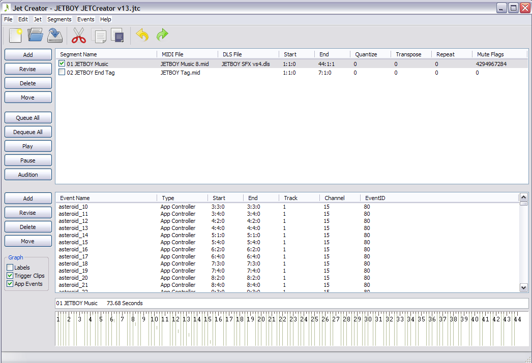 Das Hauptfenster des JET Creator wie im Bild unten aussieht. Es gibt drei Hauptabschnitte Von oben nach unten: Segmentansicht, Ereignisansicht und Zeitachse