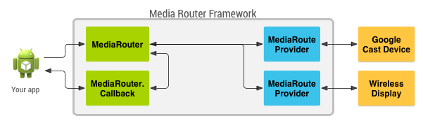 您必須取得執行個體,才能在應用程式中使用 MediaRouter 架構 MediaRouter 物件的結構,並附加 用於監聽轉送事件的 MediaRouter.Callback 物件。 透過媒體路徑傳送的內容會通過路徑的 相關聯的 MediaRouteProvider (除了少數特殊情況外) 例如藍牙輸出裝置)。圖 1 概略說明瞭 用來在裝置之間轉送內容的類別。