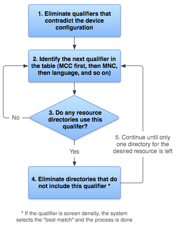 이 절차는 요청된 각 리소스에 대해 실행되지만 시스템은 일부 측면을 최적화합니다. 이러한 최적화 중 하나로, 기기 구성이 알려진 뒤에 일치하지 않는 대체 리소스가 제거될 수 있습니다. 예를 들면 설정 언어가 영어인 경우 영어가 아닌 언어로 설정된 언어 한정자가 포함된 모든 리소스 디렉터리는 확인된 리소스 풀에 포함되지 않습니다(하지만 언어 한정자가 없는 리소스 디렉터리는 계속 포함됨).