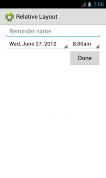 <?xml version="1.0" encoding="utf-8"?> <RelativeLayout xmlns:android="http://schemas.android.com/apk/res/android" android:layout_width="match_parent" android:layout_height="match_parent" android:paddingLeft="16dp" android:paddingRight="16dp" > <EditText android:id="@+id/name" android:layout_width="match_parent" android:layout_height="wrap_content" android:hint="@string/reminder" /> <Spinner android:id="@+id/dates" android:layout_width="0dp" android:layout_height="wrap_content" android:layout_below="@id/name" android:layout_alignParentLeft="true" android:layout_toLeftOf="@+id/times" /> <Spinner android:id="@id/times" android:layout_width="96dp" android:layout_height="wrap_content" android:layout_below="@id/name" android:layout_alignParentRight="true" /> <Button android:layout_width="96dp" android:layout_height="wrap_content" android:layout_below="@id/times" android:layout_alignParentRight="true" android:text="@string/done" /> </RelativeLayout>