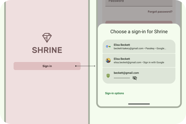 認証情報マネージャーは、パスキーなどのさまざまなログイン方法の中心的なハブであり、ユーザーがワンタップ操作でアプリにログインできるようにします。これにより、ユーザーは使用する方法を覚えておく必要がなくなり、適切なアカウントを選択することに集中できます。