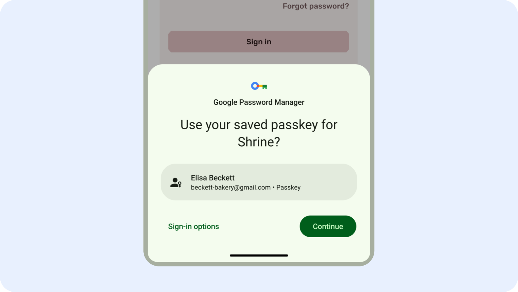 패스키를 비롯한 다양한 로그인 방법의 중앙 허브인 인증 관리자는 사용자가 원탭으로 앱에 로그인할 수 있도록 지원합니다. 이렇게 하면 사용자가 어떤 방법을 사용해야 하는지 기억할 필요가 없으며 대신 적절한 계정을 선택하는 데 집중할 수 있습니다.