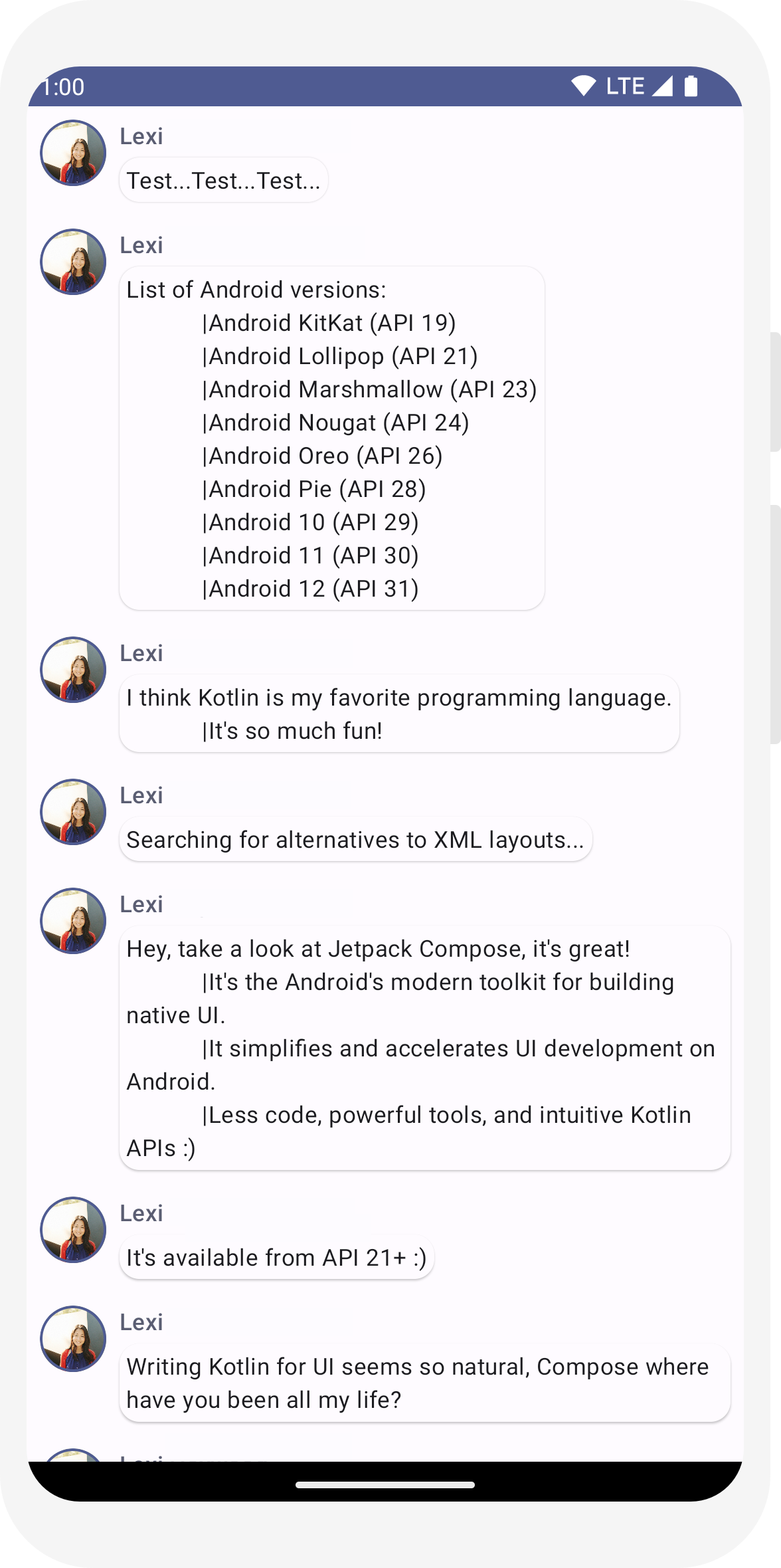 msg = Message("Lexi", "Take a look at Jetpack Compose, it's great!")