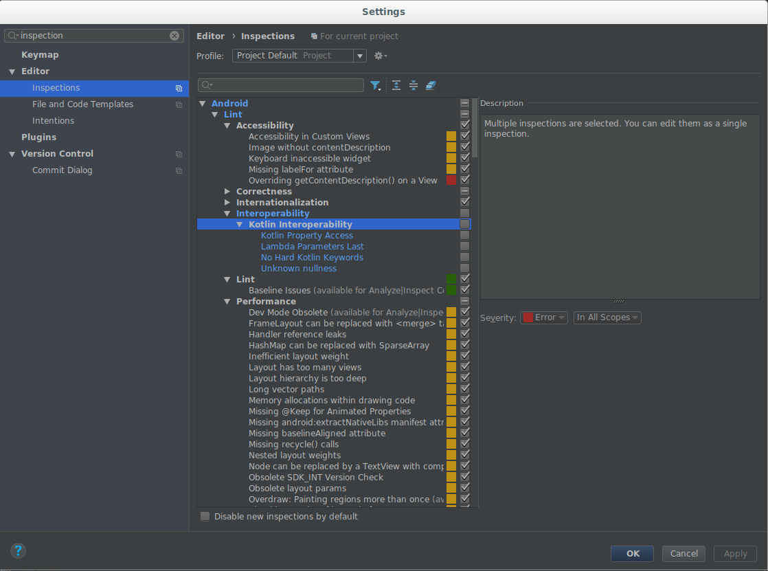 Para ativar essas verificações, vá para Arquivo > Preferências > Editor > inspeções e Marque as regras que você quer ativar em "Interoperabilidade do Kotlin":