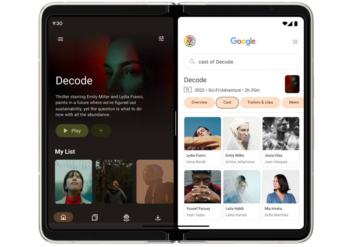 Permita que os usuários realizem várias tarefas ao mesmo tempo, colocando dois apps lado a lado. Assim, eles podem navegar por uma coleção de filmes enquanto conferem elencos e personagens, além de ouvir música enquanto procuram covers, as últimas notícias do mundo da música ou as avaliações mais recentes.