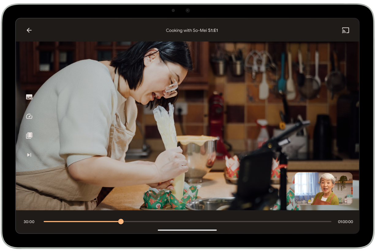 Deixe os usuários relaxarem e aproveitarem o conteúdo favorito deles com a posição de mesa em dispositivos dobráveis. Coloque a reprodução de mídia acima da dobra e os controles e conteúdo suplementar abaixo dela para criar uma experiência de visualização ou escuta que não exige o uso das mãos.