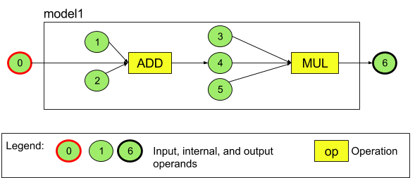Misalnya, gambar 3 merepresentasikan model dengan dua operasi: penambahan diikuti dengan perkalian. Model ini mengambil sebuah tensor input dan menghasilkan satu tensor output.