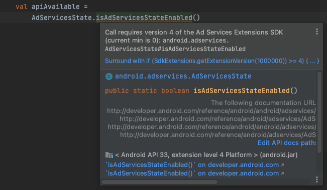 SDK टूल के सामान्य सेट की तरह ही, AdServices एपीआई रेफ़रंस से कभी-कभी पता चलता है कि कोई एपीआई, "विज्ञापन सेवाओं के एक्सटेंशन" वर्शन का हिस्सा है.