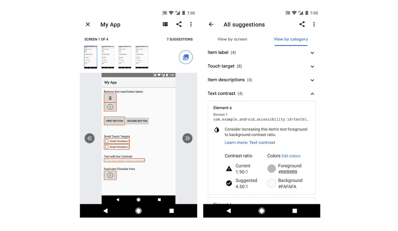 Khi thiết kế một bảng phối màu hỗ trợ tiếp cận, nhóm đã đánh giá các ứng dụng hiện có bằng ứng dụng Trình quét hỗ trợ tiếp cận của Google. Ứng dụng này có thể ghi lại các trang, ghi lại từng phần tử của giao diện và đưa ra các đề xuất cải thiện như cỡ chữ, kích thước đích chạm, độ tương phản màu, v.v. Thông tin này vô cùng hữu ích cho nhóm.