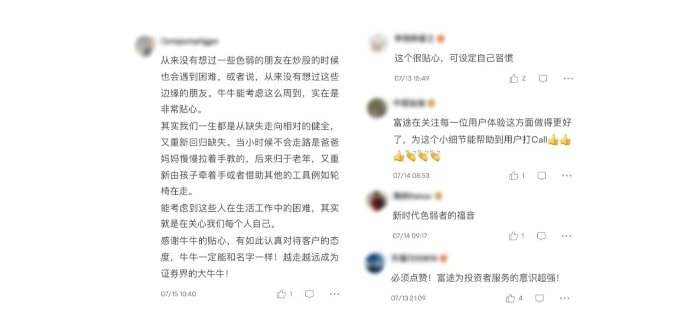 Chúng tôi luôn coi trọng ý kiến của người dùng và đã biết được qua nhiều kênh rằng một số người dùng gặp vấn đề do suy giảm thị lực về màu sắc. Những nhà đầu tư bị mù màu đỏ và xanh lục không thể phân biệt được màu đỏ và màu xanh lục, chắc chắn sẽ bị chậm trễ trong quá trình đầu tư. Vì vậy, chúng tôi đã giới thiệu một bảng phối màu mới, được tối ưu hoá cho người bị suy giảm thị lực về màu sắc, bao gồm tất cả các thành phần trực quan của ứng dụng, cho phép người dùng điều chỉnh màn hình theo nhu cầu của họ. —— Garit, Giám đốc trải nghiệm người dùng của ứng dụng Futubull