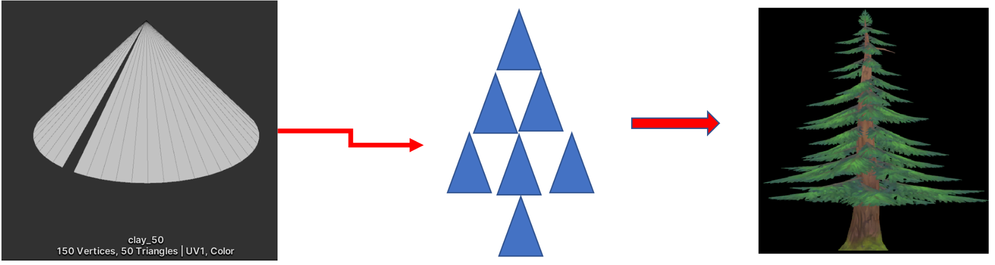 클레이는 컬링 및 충돌 단계에서 호환되는 가시적 렌더링 가능한 객체의 목록을 빌드하는 것으로 시작됩니다. 그런 다음 Clay는 식별된 각 객체의 렌더링 정보를 SSBO로 생성합니다. 이 프로세스는 Unity 렌더러 DrawMeshInstancedIndirect 함수를 사용하여 간접 인스턴스화된 렌더링을 사용할 수 있는 컴퓨팅 셰이더를 통해 실행됩니다. 간접 렌더링을 사용하면 인스턴스 정보와 인스턴스 수 매개변수가 GPU에서 직접 생성됩니다. 객체를 그릴 때 Clay는 기존의 객체 메시를 결합하는 대신 그림과 같이 원뿔 메시를 결합합니다.