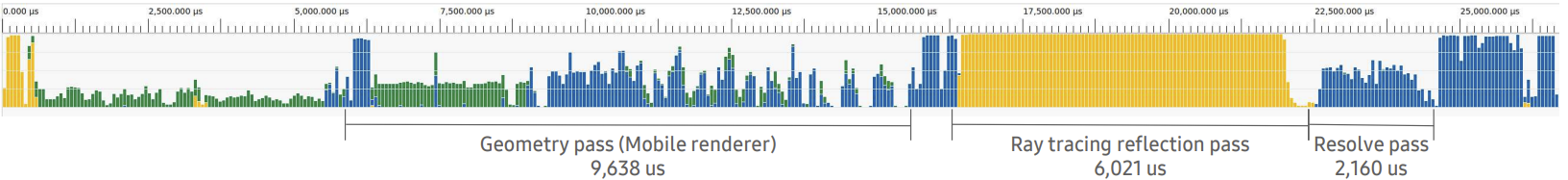 Özellikle yansımalarda ışın izlemenin performans üzerindeki etkisi sahneye çok bağlıydı. Büyük yansıtıcı yüzeylerin bulunduğu sahnelerde yansımalar, kare süresinin önemli bir bölümünü (%30-40) tüketebilir. Işın izlemenin uygulanabilir hale getirilmesi için optimizasyonlar çok önemliydi. Ekip, ek yükü azaltmak ve verimliliği artırmak için çok sayıda teknik kullandı: Boşa harcanan işleme işlemlerini en aza indirmek için karo tabanlı bir oluşturma yaklaşımı kullanma, çizim çağrılarını azaltmak için aynı malzeme ve geometri örneklerini gruplandırma, yalnızca görünür geometriler için hızlandırma yapıları oluşturma ve AS oluşturma için eşzamansız hesaplama kullanma. Bu stratejiler, işleme süresini ve GPU yükünü önemli ölçüde azaltarak mobil donanımda gerçek zamanlı ışın izlemeyi mümkün kıldı.