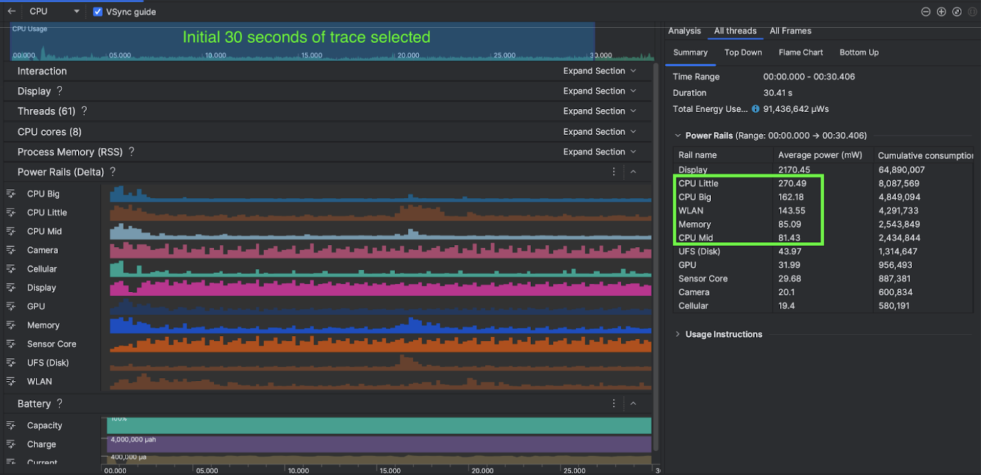 | power.rail.cpu.mid | Alto | 30 | Bajo | 470.916 mW | 14.60% |