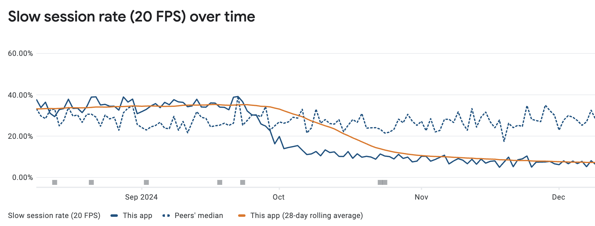 סשנים איטיים הוא מדד של 'תפקוד האפליקציה' ב-Google Play Console. בסשן איטי יש יותר מ-25% פריימים איטיים. פריים נחשב לאיטי אם הוא: