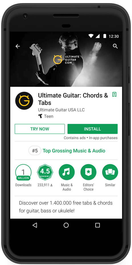 Ultimate Guitar は、多数の活発な Android ユーザーから成るファン層を抱えつつ、常に新しいユーザーにリーチしたいと考えています。試用回数の増加がユーザー数の増加に結びつくという確信に基づき、Google Play Instant と [今すぐ試す] 機能を導入することにしました。