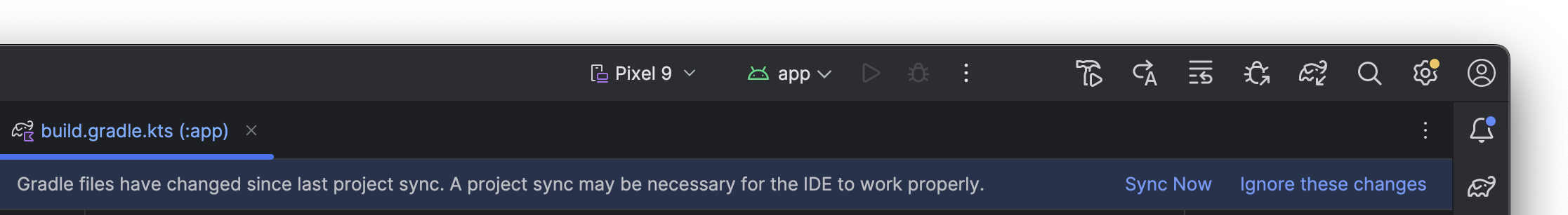 프로젝트에서 빌드 구성 파일이 변경되면 Android 스튜디오는 프로젝트 파일을 동기화하도록 요청합니다. 이렇게 하면 빌드 구성 변경사항을 가져올 수 있고 구성에서 빌드 오류가 발생하지 않도록 검사를 실행할 수 있습니다.