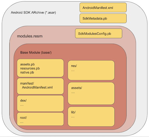 SdkBundleConfig.pb: plik konfiguracji w formacie proto, zawierający lista pakietów SDK używanych w czasie działania aplikacji, od których zależy działanie Twojego pakietu SDK. Aby uzyskać pełną definicję znajdziesz wsdk_bundle_config.proto.modules.resm: plik ZIP zawierający wszystkie dane potrzebne do wygenerowania pliki APK z pakietu SDK.SdkModulesConfig.pb: plik konfiguracji w formacie proto. Ten plik zawiera nazwę pakietu SDK, wersję i nazwę klasy punktu wejścia pakietu SDK dla platforma (SandboxedSdkProvider). Pełną definicję znajdziesz tutajsdk_modules_config.proto.base/: pojedynczy moduł zawierający kod i zasoby SDK.manifest/: plik manifestu pakietu SDK w formacie proto.dex/: skompilowany kod w formacie DEX. Można podać wiele plików DEX.res/,lib/,assets/: te katalogi są identyczne z katalogami w typowy plik APK. Ścieżki w tych katalogach są zachowywane podczas generowania Pliki APK pakietu SDK.root/: w tym katalogu są przechowywane pliki, które zostaną później przeniesione do katalogu głównego pakietów APK. Mogą one na przykład obejmować zasoby oparte na Javie, które Twój pakiet SDK wczytuje się za pomocąClass.getResource(). Ścieżki w tym katalogu również są zachowywane.