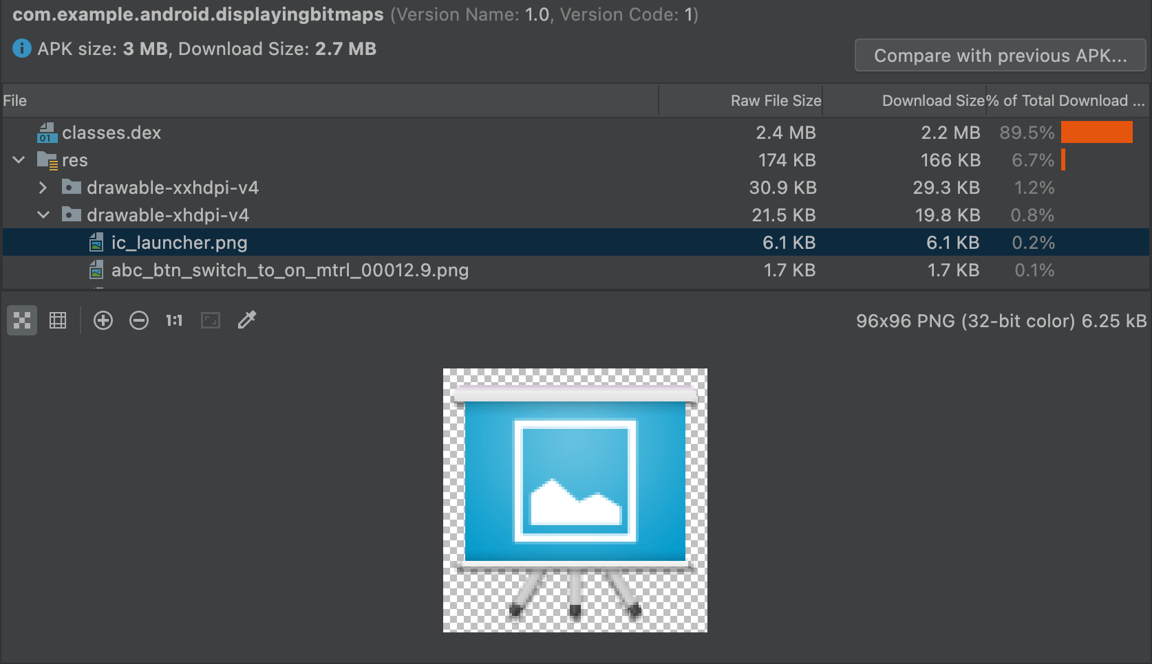 Android 스튜디오에는 빌드 프로세스가 완료된 후 APK 또는 Android App Bundle 구성에 관한 유용한 정보를 즉시 제공하는 APK Analyzer가 포함되어 있습니다.