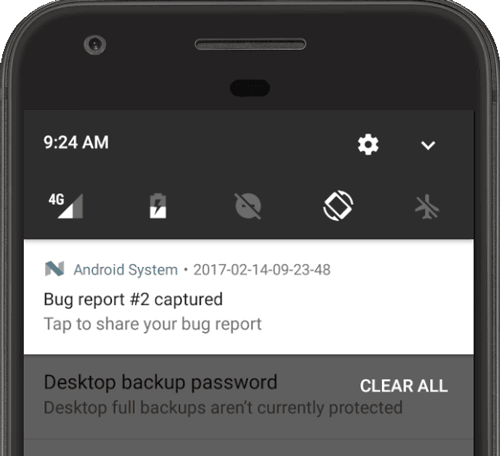 Un informe de errores contiene registros del dispositivo, seguimientos de pila y otra información de diagnóstico para ayudarte a encontrar y corregir errores en tu app. Para capturar un informe de errores desde tu dispositivo, usa la opción para desarrolladores Iniciar informe de errores en el dispositivo, el menú de Android Emulator o el comando adb bugreport en tu máquina de desarrollo.
