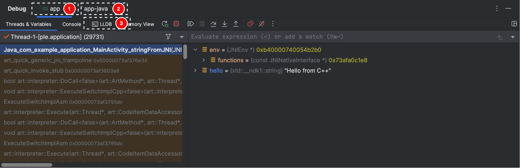 Android 스튜디오는 자바 디버거와 LLDB 모두를 앱 프로세스에 연결하므로, 앱을 다시 시작하거나 디버그 구성을 변경하지 않고도 자바 코드와 네이티브 코드 모두에서 중단점을 검사할 수 있습니다.