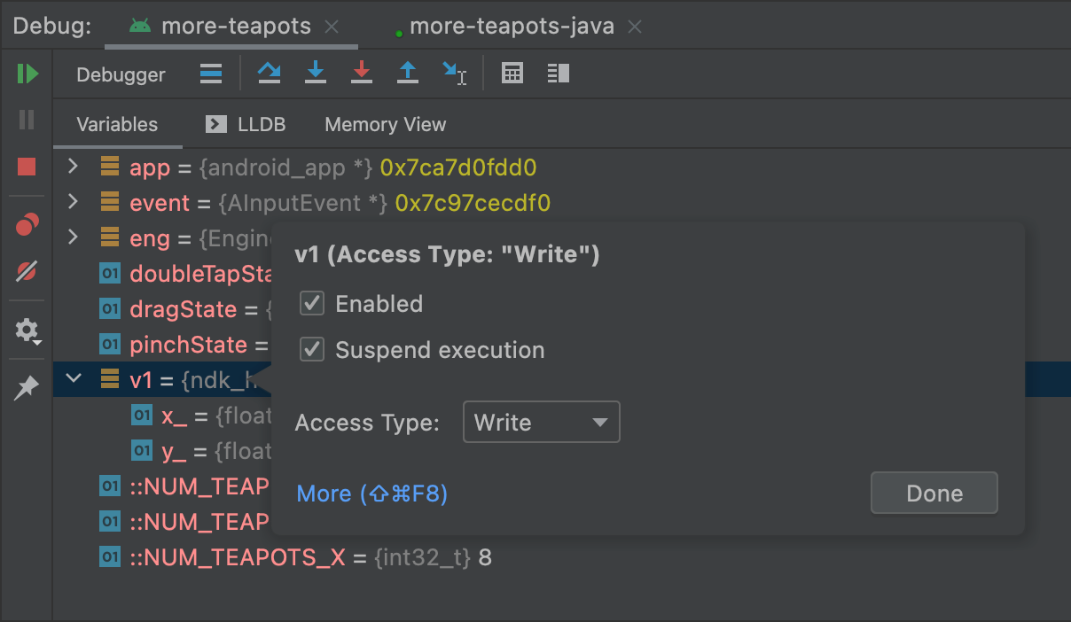 في Android Studio، يمكنك إنشاء نقطة مراقبة أثناء وقت التشغيل من خلال اختيار متغير معيّن، ولكن يحدّد LLDB نقطة المراقبة فقط لكتلة الذاكرة التي يخصّصها النظام لهذا المتغير، وليس للمتغير نفسه. يختلف ذلك عن إضافة متغيّر إلى لوحة "المراقبة"، ما يتيح لك مراقبة قيمة متغيّر ولكن لا يسمح لك بتعليق عملية تطبيقك عندما يقرأ النظام قيمته أو يغيّرها في الذاكرة.