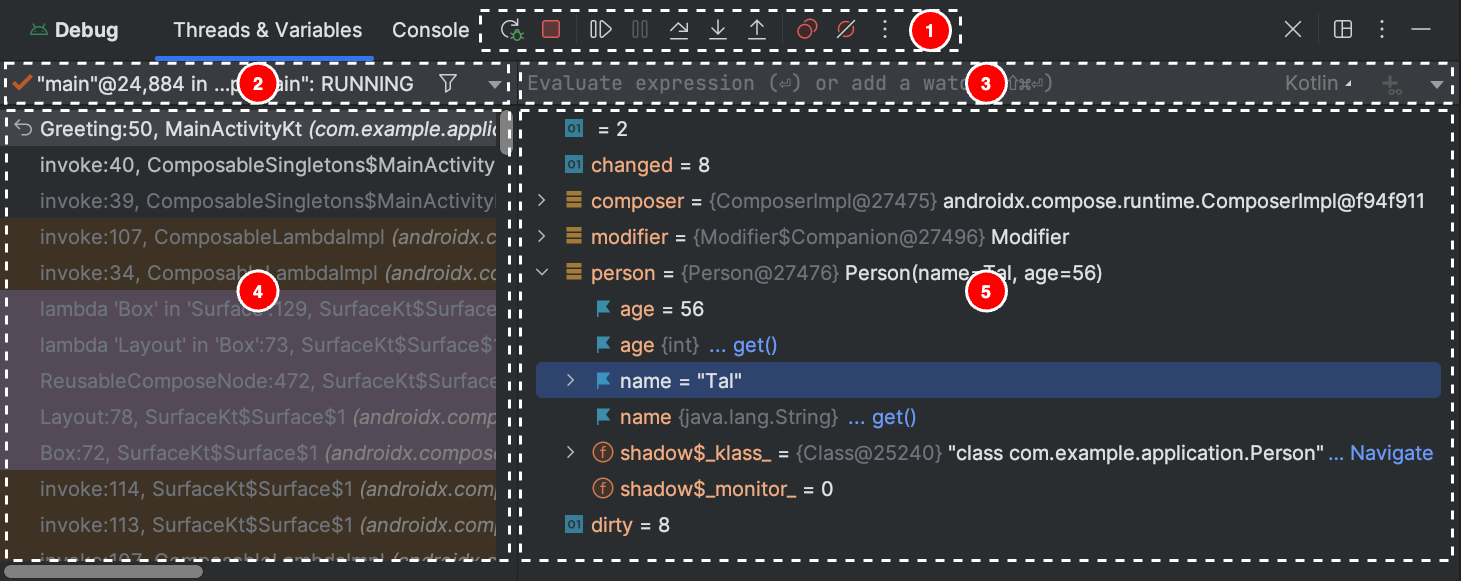 - Un punto de interrupción de método pausa la ejecución de tu app cuando ingresa en un método específico o sale de él. Mientras la app está detenida, puedes examinar variables, evaluar expresiones y, luego, continuar la ejecución línea por línea para determinar las causas de los errores en el tiempo de ejecución. Cuando estableces un punto de interrupción en una función de componibilidad, el depurador enumera los parámetros del elemento componible y su estado para ayudarte a identificar los cambios que podrían haber causado la recomposición.