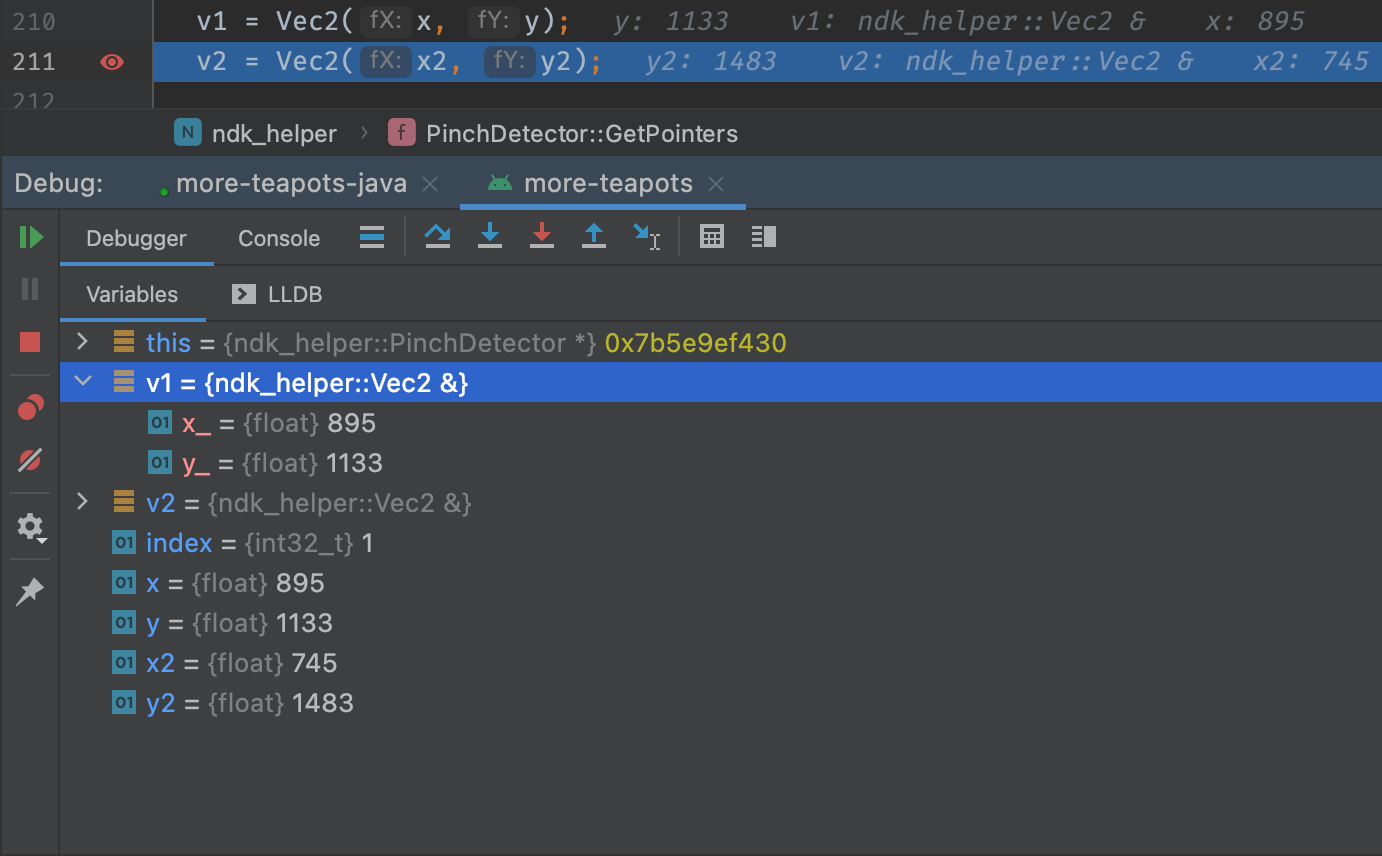 Android Studio collega sia il debugger Java che LLDB al processo dell'app, in modo da poter esaminare i punti di interruzione sia nel codice Java che in quello nativo senza riavviare l'app o modificare la configurazione di debug.