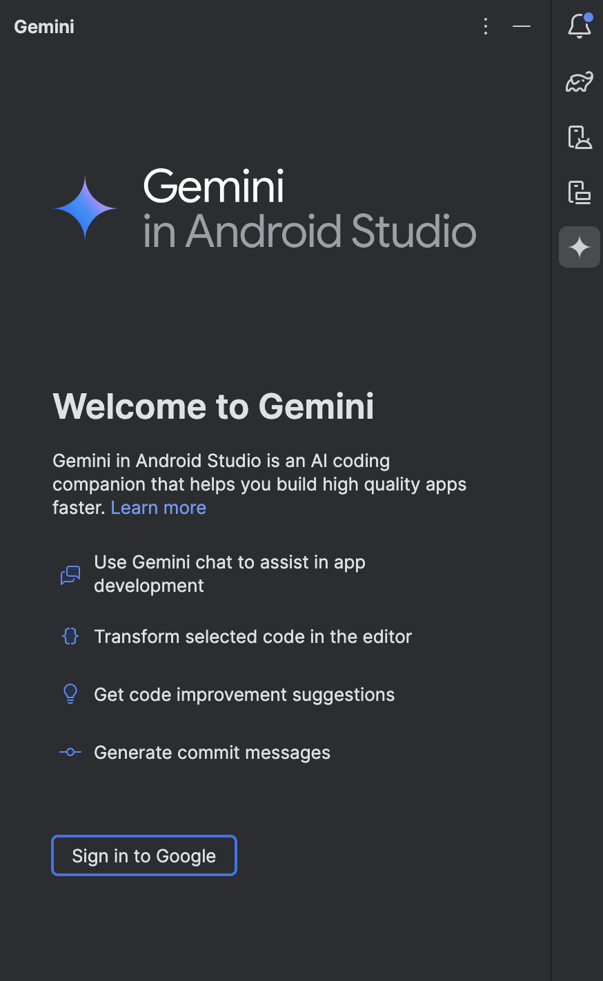 หลังจากทำตามขั้นตอนเหล่านี้แล้ว กล่องแชทจะปรากฏขึ้นและคุณจะเริ่มใช้ Gemini ได้ คุณสามารถตรวจสอบได้อย่างรวดเร็วว่าได้เปิดใช้ Gemini หรือไม่โดยดูไอคอน Gemini ที่ด้านล่างของ IDE ของ Studio ได้ทุกเมื่อ