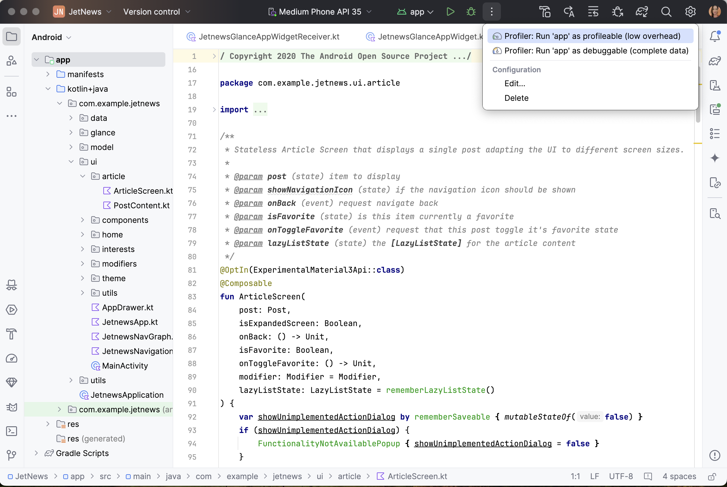 การดำเนินการกำหนดค่าและการโปรไฟล์จะได้รับการปรับปรุงให้มีประสิทธิภาพมากขึ้นในวิดเจ็ตการเรียกใช้แบบใหม่ โดยระบบจะย้ายการดำเนินการโปรไฟล์ไปยังเมนูรายการเพิ่มเติม