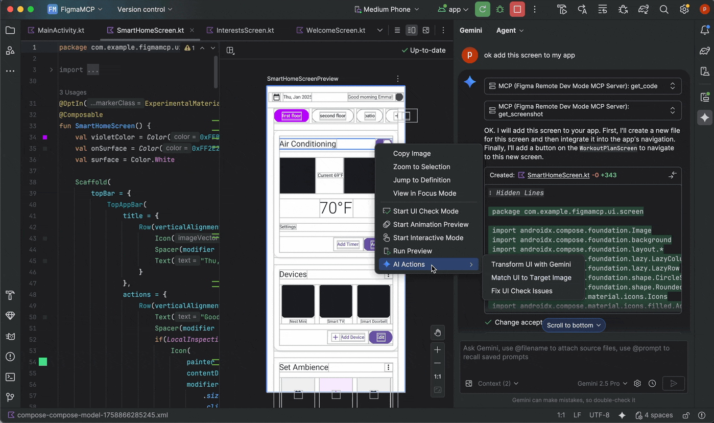 初期実装が完了したら、それを繰り返し調整して、ピクセル単位で完璧なものにすることができます。Compose プレビューを右クリックして、[AI Actions] > [Match UI to Target Image] を選択します。これにより、リファレンス デザインをアップロードすると、エージェントが UI をデザインにできるだけ近づけるためのコード変更を提案します。