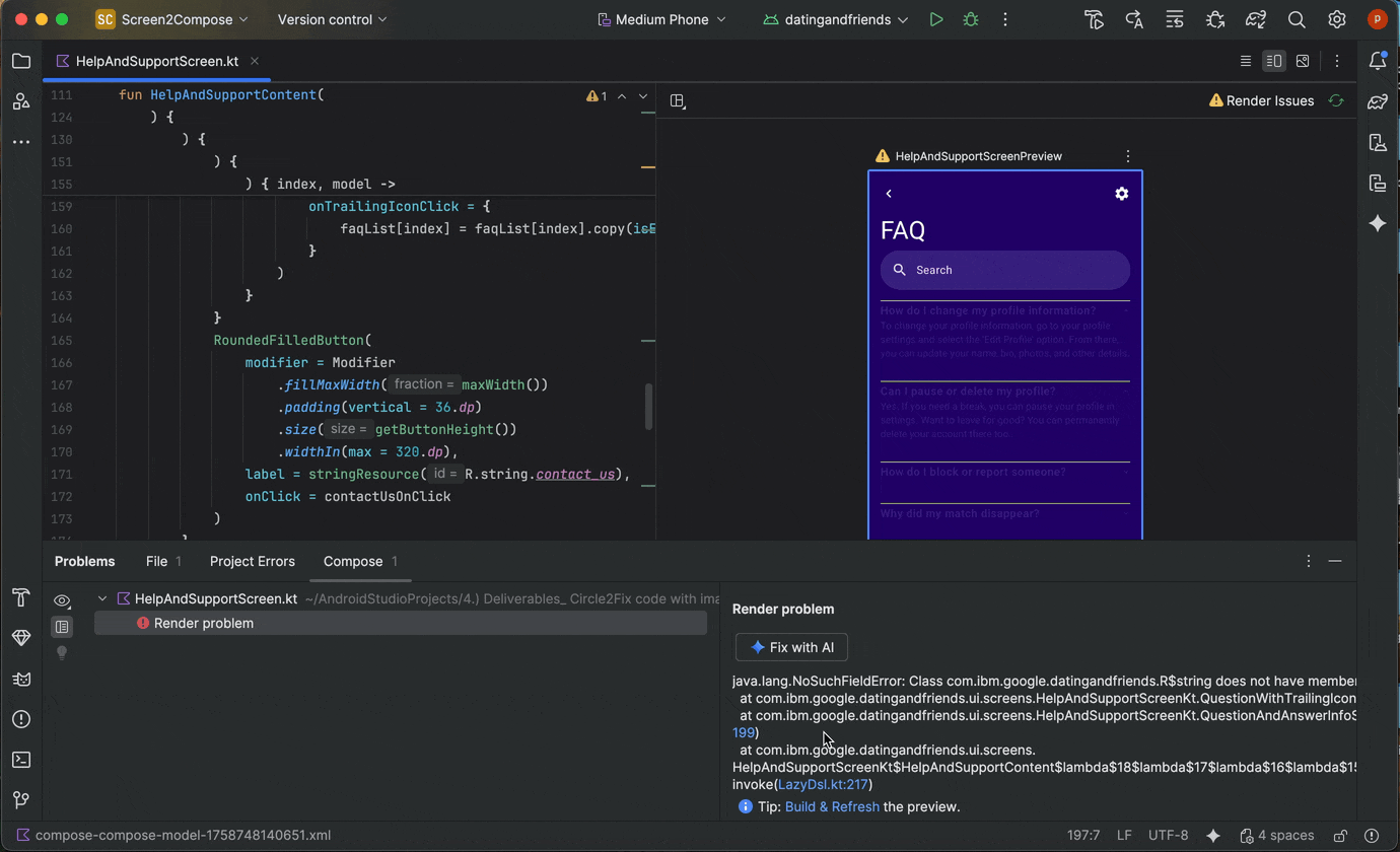 Compose プレビューを生成するエントリ ポイント プレビューのレンダリング エラーを修正: Compose プレビューのレンダリングが失敗した場合、Gemini がデバッグをサポートできるようになりました。エージェントを使用してエラー メッセージとコードを分析し、根本原因を特定して修正を適用します。