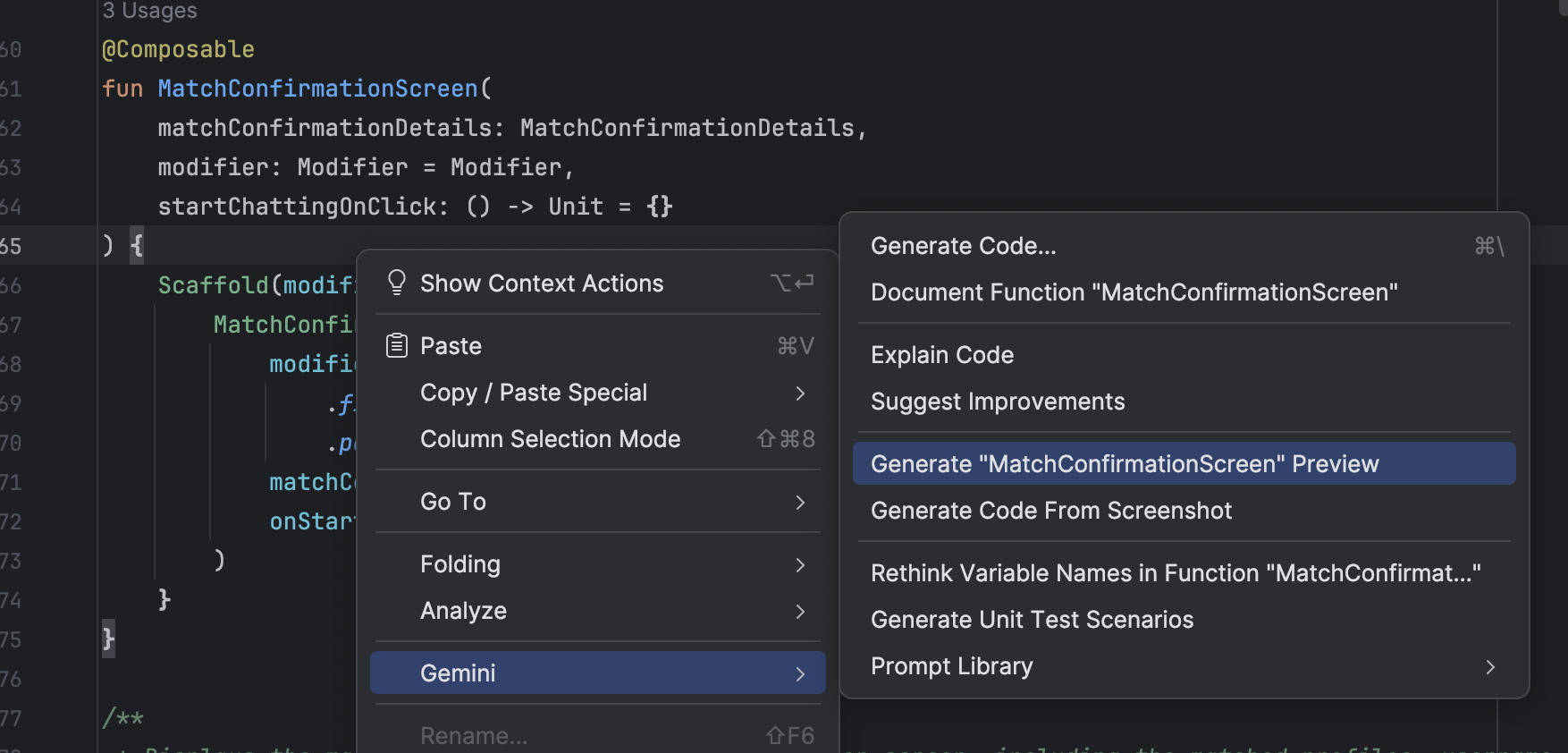 • إنشاء معاينة في Compose: تم تحسين هذه الميزة باستخدام وكيل Gemini لتقديم نتائج أكثر دقة. عند العمل في ملف يتضمّن دوال قابلة للإنشاء ولكن لا يتضمّن تعليقات توضيحية ‎ @Preview، يمكنك النقر بزر الماوس الأيمن على الدالة القابلة للإنشاء واختيار Gemini > إنشاء معاينة [اسم الدالة القابلة للإنشاء] . سيتمكّن الوكيل الآن من تحليل العنصر القابل للإنشاء بشكل أفضل لإنشاء الرمز النموذجي اللازم مع المَعلمات الصحيحة، وذلك للمساعدة في التأكّد من إضافة معاينة تم عرضها بنجاح.