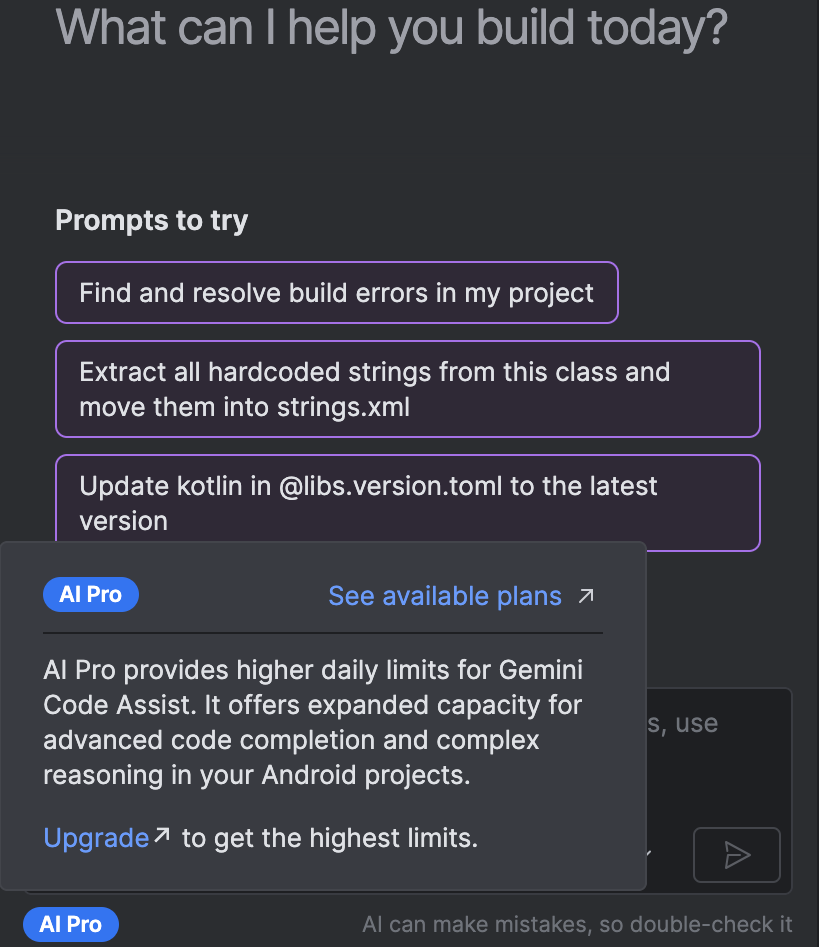 Android Studio Panda 4 Canary 2 introduces access to an enhanced Agent Mode experience when you subscribe to the Google One AI Pro or Ultra plans. The Google One integration supercharges your Android development with higher rate limits and an expanded context window for the default Gemini model. If you are subscribed to a Google One AI Pro or Ultra plan, you can take advantage of these benefits automatically when you sign in to your Google Account in Android Studio.