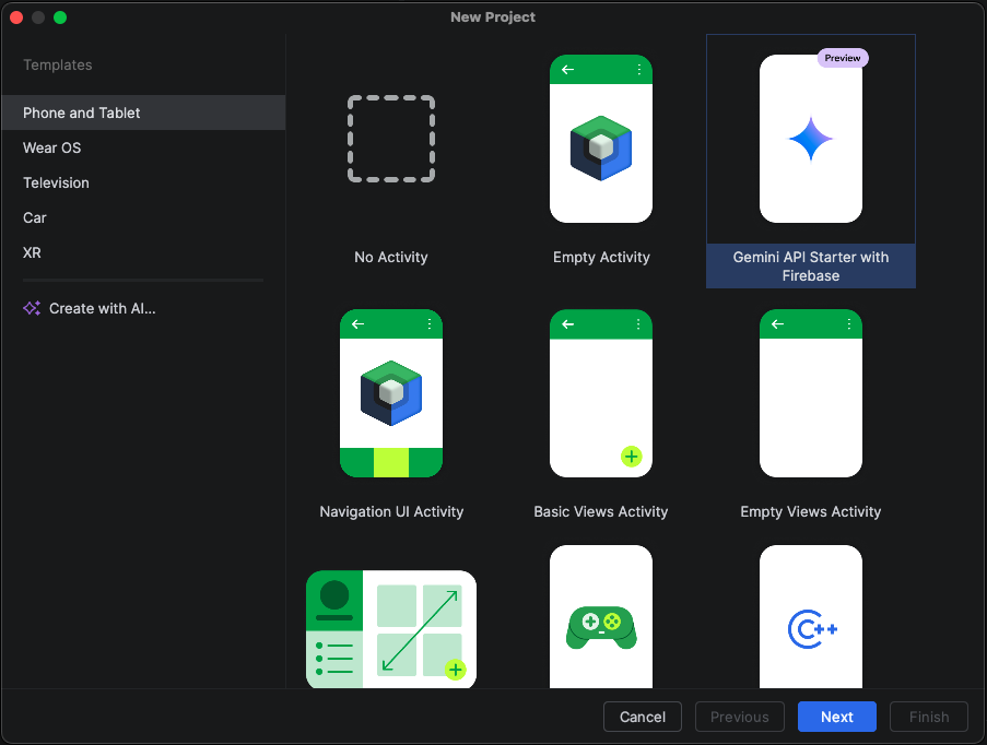 To get started, go to File > New > New Project and select the Gemini API Starter template from the list of available project types.